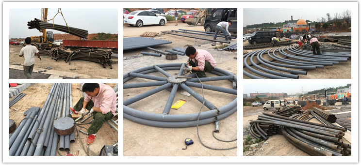 鋼材選用Q235/Q345碳素鋼、熱鍍鋅或螺旋及無縫高強(qiáng)度優(yōu)質(zhì)鋼材;拋丸防銹處理、噴漆,數(shù)控線切割、機(jī)拉/滾彎,鋼構(gòu)拼接造型及安裝工藝等。