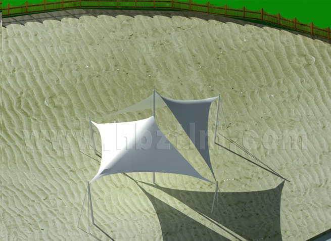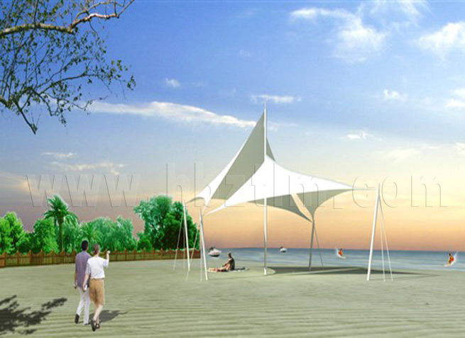 膜材采用PVDF國產或者進口建筑膜材、PTFE玻璃纖維建筑膜材、ETFE透明的永久性建筑膜材;自動放樣裁剪,高頻焊接,拉伸效果超強,曲線成型可千變萬化;膜材質保一般可達15-20年。