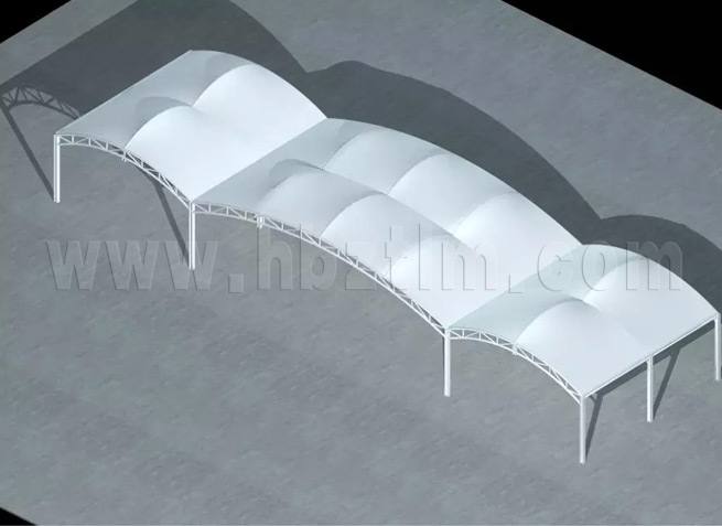 膜材采用PVDF國產(chǎn)或者進口建筑膜材、PTFE玻璃纖維建筑膜材、ETFE透明的永久性建筑膜材;自動放樣裁剪,高頻焊接,拉伸效果超強,曲線成型可千變?nèi)f化;膜材質(zhì)保一般可達15-20年。
