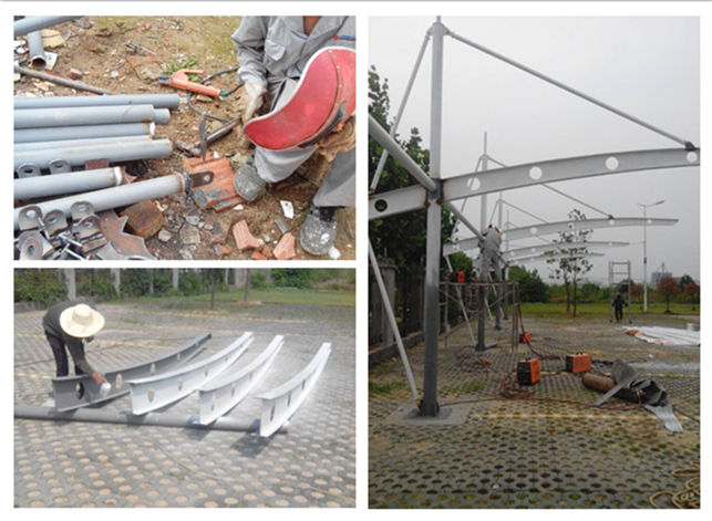 漢川吊塔式異形鋼膜結(jié)構(gòu)停車棚,本項(xiàng)目采用前軟邊后硬邊張拉形式;結(jié)構(gòu)由立柱、拉桿、挑梁、橫桿構(gòu)成,其挑梁和中間橫桿一般采用異形鋼挑梁形式,美觀而不積水且抗負(fù)荷能力強(qiáng);膜材采用3010白色建筑膜材,15年質(zhì)保,整體結(jié)構(gòu)美觀實(shí)用,經(jīng)濟(jì)牢固,臻至完美。