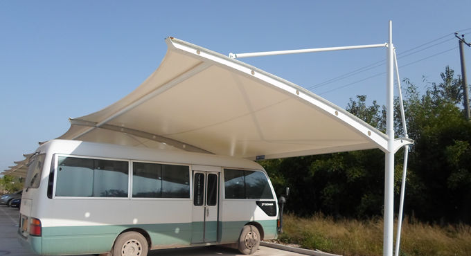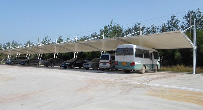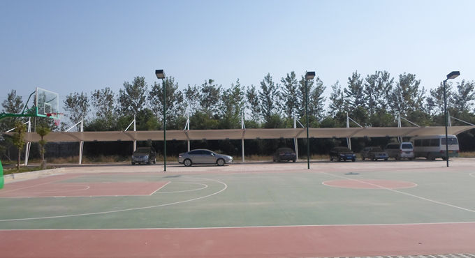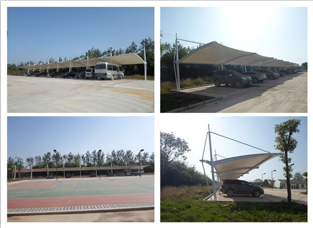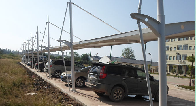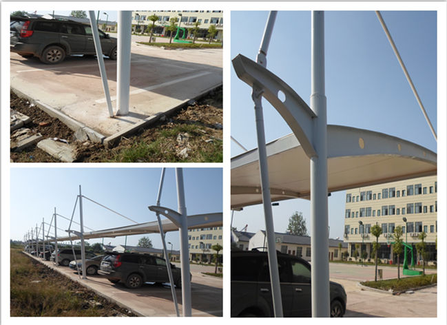 恒天嘉華吊塔式異形鋼膜結構車棚,本項目采用前軟邊后硬邊張拉形式;結構由立柱、拉桿、挑梁、橫桿構成,其挑梁和中間橫桿一般采用異形鋼挑梁形式,美觀而不積水且抗負荷能力強;膜材采用ZZF白色建筑膜材,15年質保,整體結構美觀實用,經濟牢固,臻至完美。