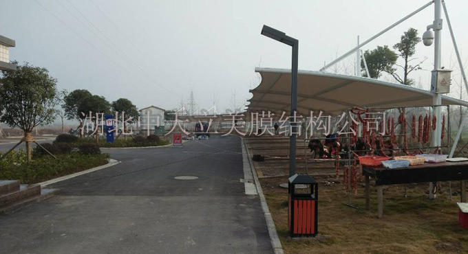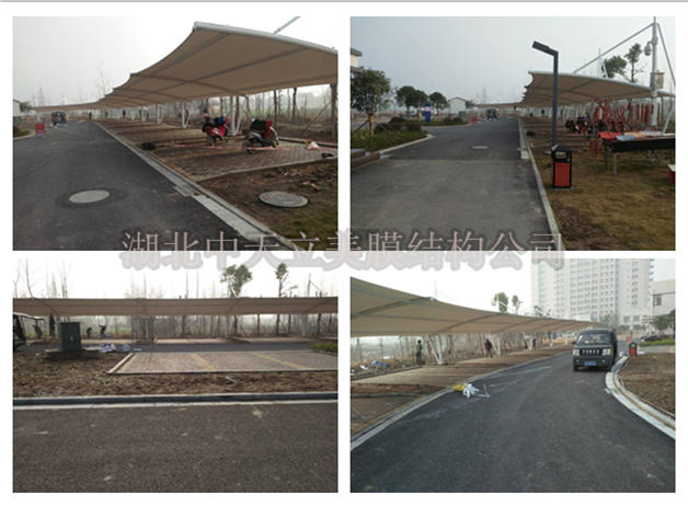 荊州江陵吊塔式圓管膜結(jié)構(gòu)車棚,本項目采用前軟邊后硬邊張拉形式,結(jié)構(gòu)由立柱、拉桿、挑梁、橫桿構(gòu)成,其挑梁和中間橫桿一般采用弧管形式,美觀而不積水且抗負荷能力強;膜材采用ZZF白色建筑膜材,15年質(zhì)保,整體結(jié)構(gòu)美觀實用,經(jīng)濟牢固,臻至完美。