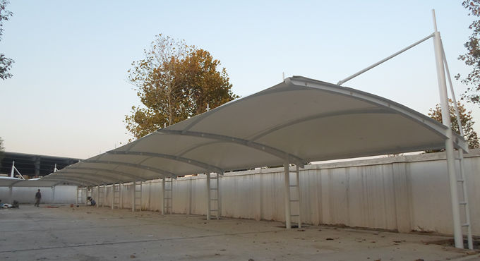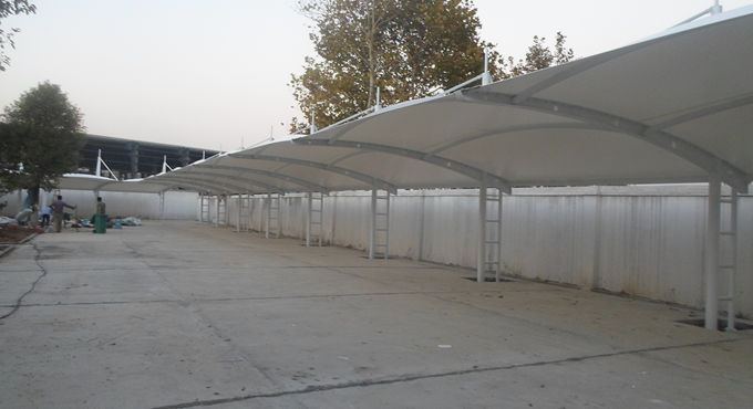 新溝街道辦事處吊塔式異形鋼膜結構停車棚,本項目采用前軟邊后硬邊張拉形式;結構由立柱、拉桿、挑梁、橫桿構成,其挑梁和中間橫桿一般采用異形鋼挑梁形式,美觀而不積水且抗負荷能力強;膜材采用PVDF白色車棚專用建筑膜材,15年質保,整體結構美觀實用,經(jīng)濟牢固,臻至完美。