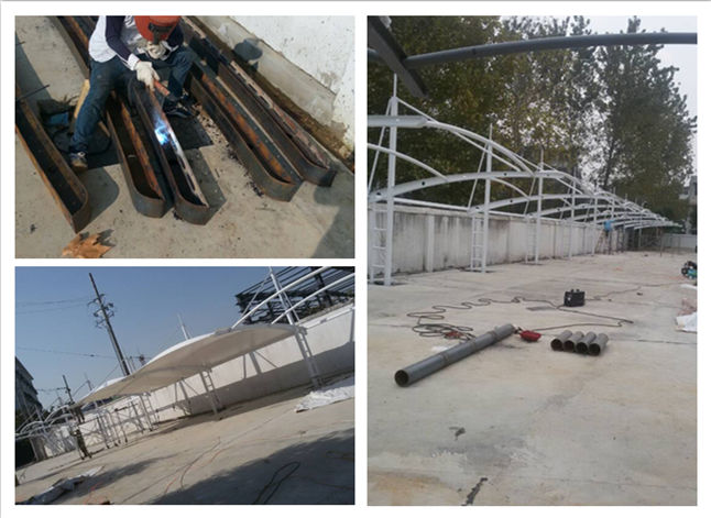 圖1 新溝吊塔式異形鋼膜結構停車棚鋼結構現(xiàn)場施工圖