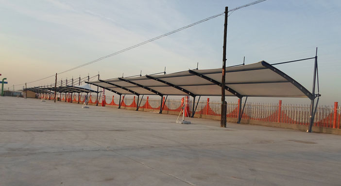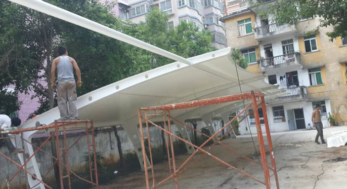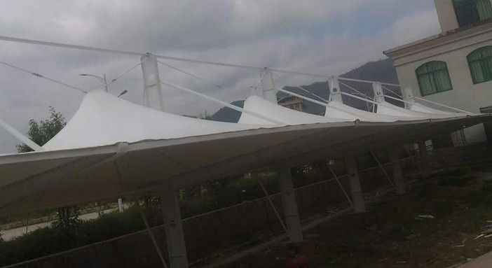 新豐縣環(huán)境保護(hù)局異型鋼冒頂膜結(jié)構(gòu)車棚,本頂目為冒頂式膜結(jié)構(gòu)車棚,采用連帽全軟邊張拉形式,美觀而實(shí)用; 膜材采用PVDF白色車棚專用建筑膜材,整體結(jié)構(gòu)從設(shè)計(jì)到施工,都精工細(xì)作,臻至完美。