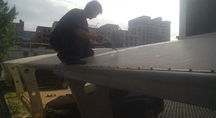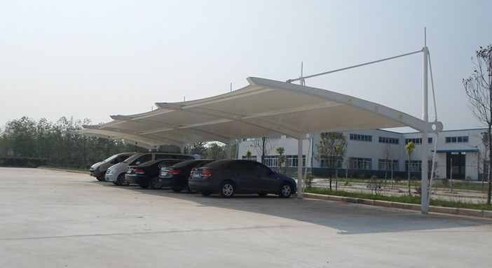 五子溝武漢機(jī)床廠T型圓管膜結(jié)構(gòu)車棚,本項(xiàng)目采用前軟邊后硬邊張拉形式,結(jié)構(gòu)由立柱、拉桿、挑梁、橫桿構(gòu)成,其挑梁和中間橫桿一般采用弧型圓管挑梁形式,美觀而不積水且抗負(fù)荷能力強(qiáng);膜材采用PVDF白色車棚專用建筑膜材,15年質(zhì)保,整體結(jié)構(gòu)美觀實(shí)用,經(jīng)濟(jì)牢固,臻至完美。