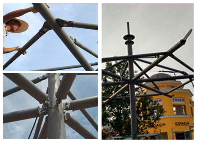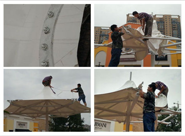 圖2 百年奧特萊斯冒頂六邊休閑景觀傘膜結(jié)構(gòu)拉膜現(xiàn)場(chǎng)施工圖