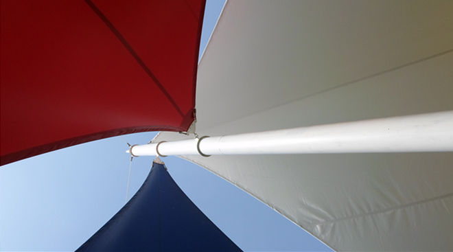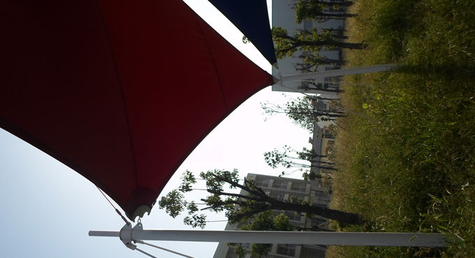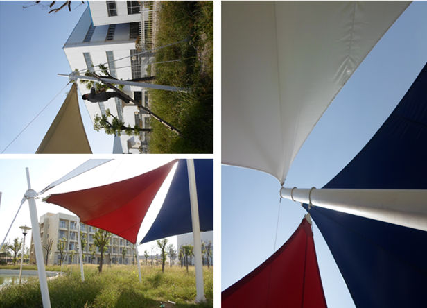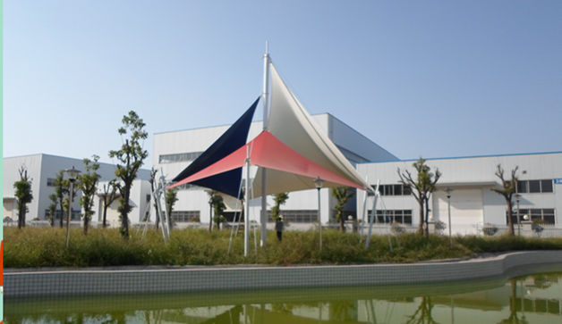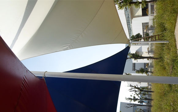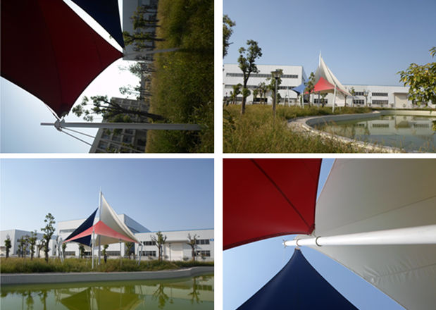 恒天嘉華景觀張拉膜結(jié)構(gòu)工程,該項(xiàng)目是典型的景觀張拉膜結(jié)構(gòu),俗稱飛燕。膜材采用紅白藍(lán)三種顏色膜材組成,色彩鮮明;其結(jié)構(gòu)以鋼柱為受力支撐點(diǎn),全軟邊鋼索預(yù)應(yīng)力張拉成型,各環(huán)節(jié)制作安裝精度要求極高,整體結(jié)構(gòu)輕盈而優(yōu)美,既有鋼柱、鋼索牽引的力量之美,又有pvdf建筑膜材的柔性曲線之美,大氣、時(shí)尚、牢固實(shí)用,剛與柔完美融合,因其亮麗色彩,成為單位一道獨(dú)特的風(fēng)景。