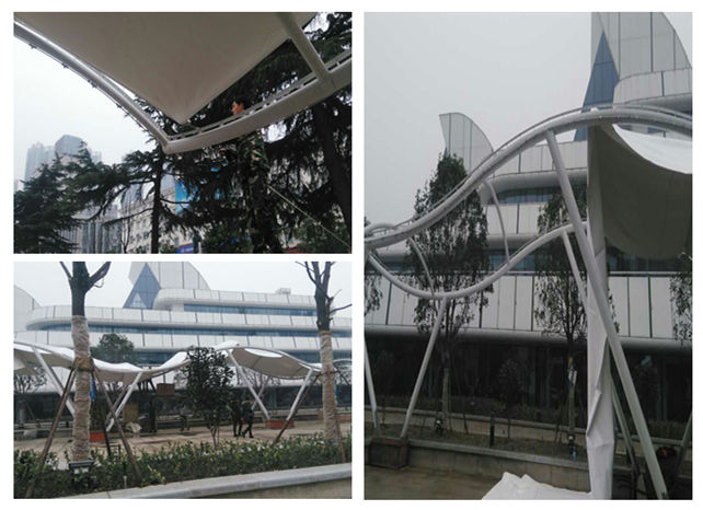 圖2 武漢科技館張拉膜景觀棚工程現(xiàn)場施工圖