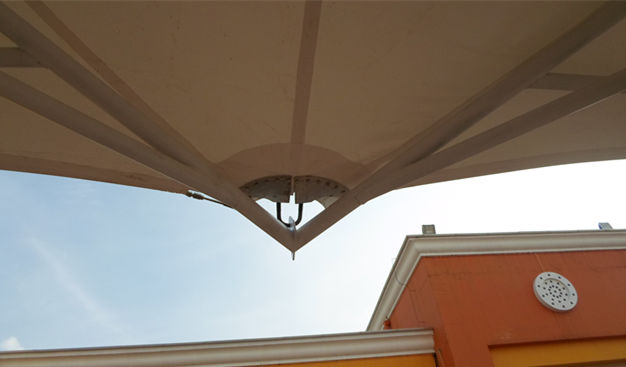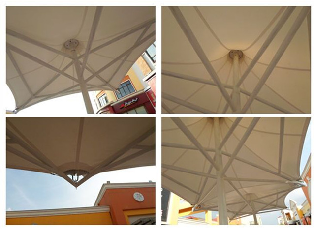 武漢百聯(lián)奧特萊斯購物廣場三連帽休閑景觀遮陽傘膜結(jié)構(gòu),該項目為永久式景觀遮陽傘,其結(jié)構(gòu)為內(nèi)撐式冒頂膜結(jié)構(gòu),單帽單立柱支撐,該項目每個都為3連帽,中高側(cè)低的連體形式,pvdf建筑膜材裁剪為3連帽整張設(shè)計張拉,對施工工藝、精度要求高,這種結(jié)構(gòu)是很多景觀遮陽項目的選擇,其尺寸不受限制,可大可小,可單冒頂,也可無限連帽,為了結(jié)構(gòu)的完美,冒頂裝飾可根據(jù)現(xiàn)場環(huán)境和結(jié)構(gòu)需要設(shè)計,該冒頂采用立桿圓盤差異性設(shè)計,美觀而實用。