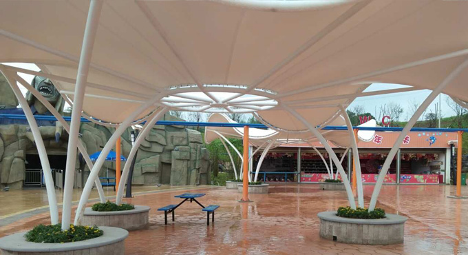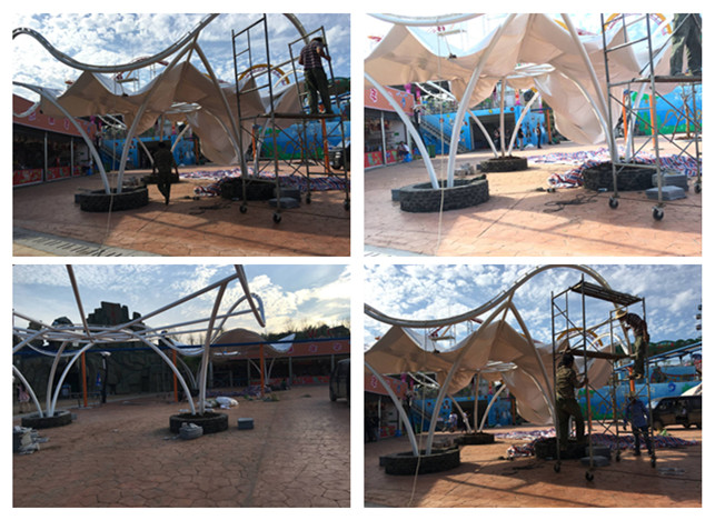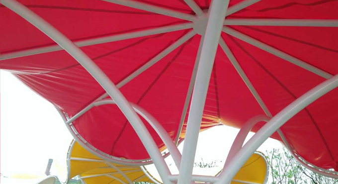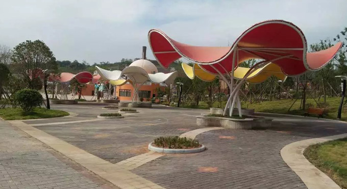 荊門市歡樂世界景觀膜結(jié)構,該項目結(jié)構以荷葉的外形為基本參照設計,全弧管結(jié)構拼裝,做工精細,整體流線型的外形和建筑膜材全硬邊式張拉給人以剛?cè)嶂?,為了豐富其視角效果,我們采用了彩色建筑膜以示渲染,作為公園的休閑景觀,既給人以納涼之處,又給整體環(huán)境以時尚現(xiàn)代之美。此類結(jié)構被廣泛應用于公園、江河湖畔、廣場、景區(qū)等。