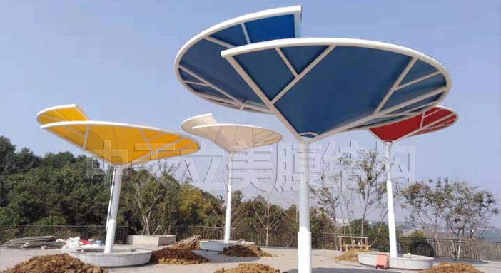 此次張拉膜項(xiàng)目我司設(shè)計(jì)師結(jié)合樂(lè)鄉(xiāng)公園主題環(huán)境設(shè)計(jì)了這款極具設(shè)計(jì)感的葉子造型,高低不異,錯(cuò)落有致鋼結(jié)構(gòu)骨架搭配五個(gè)顏色各異的彩色膜材,造型逼真同時(shí)又不失設(shè)計(jì)感 ,游客一到樂(lè)鄉(xiāng)公園就能遠(yuǎn)遠(yuǎn)看到,為樂(lè)鄉(xiāng)公園大門增添一份亮麗的風(fēng)景線。