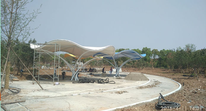 荊門市千佛洞植物園一期二標(biāo)園林景觀膜結(jié)構(gòu)工程?,該項目結(jié)構(gòu)以荷葉的外形為基本參照設(shè)計,全弧管結(jié)構(gòu)拼裝,做工精細,整體流線型的外形和建筑膜材全硬邊式張拉給人以剛?cè)嶂?,為了豐富其視角效果,我們采用了彩色建筑膜以示渲染,作為公園的休閑景觀,既給人以納涼之處,又給整體環(huán)境以時尚現(xiàn)代之美。此類結(jié)構(gòu)被廣泛應(yīng)...