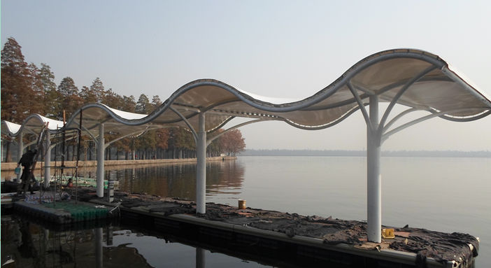 武漢東湖執(zhí)法艇碼頭景觀膜結(jié)構(gòu)?,該項目結(jié)構(gòu)為S型景觀功能性膜結(jié)構(gòu),也為波浪型結(jié)構(gòu),其立柱可放中間或者是兩側(cè),根據(jù)功能的需要,多為弧管連接,展現(xiàn)其優(yōu)美的線條感,通常在出入口、通道連廊、車站碼頭或者公園、廣場等地方運用的極為廣泛。
