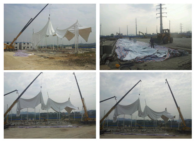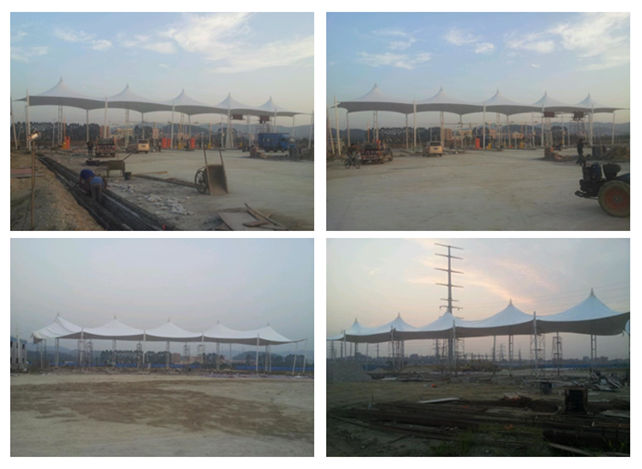 圖1 河南高速公路膜結(jié)構(gòu)收費站大棚現(xiàn)場施工圖