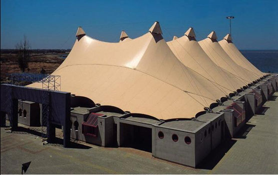 建筑膜材廣泛應(yīng)用于大型公共設(shè)施:體育場館的屋頂系統(tǒng)、機場大廳、展覽中心、站臺、景觀亭蓬等。