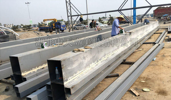 鋼材進廠了,一車車的鋼材運到了施工現(xiàn)場, 工程施工人員正在進行鋼結(jié)構(gòu)打磨除銹,鋼結(jié)構(gòu)表面油漆防腐處理。
