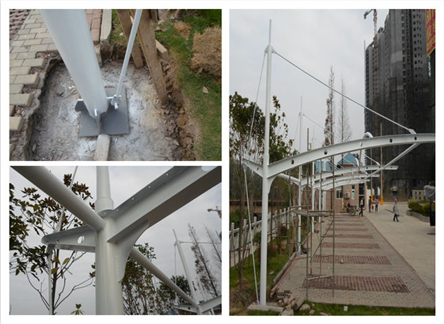 湖北長江楚韻吊塔式異型鋼膜結(jié)構(gòu)車棚,本項目采用前軟邊后硬邊張拉形式;結(jié)構(gòu)由立柱、拉桿、挑梁、橫桿構(gòu)成,其挑梁和中間橫桿一般采用異形鋼挑梁形式,美觀而不積水且抗負(fù)荷能力強;膜材采用ZZF白色建筑膜材,15年質(zhì)保,整體結(jié)構(gòu)美觀實用,經(jīng)濟(jì)牢固,臻至完美。
