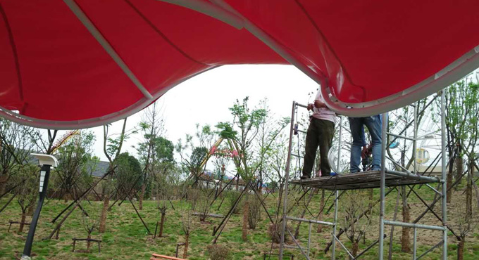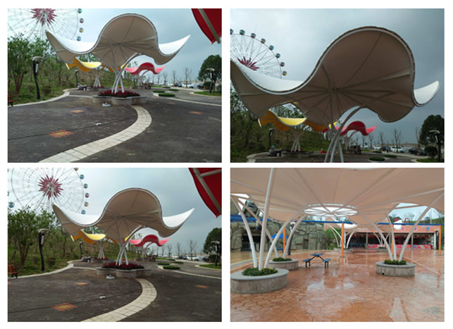 荊門市歡樂世界景觀膜結(jié)構,該項目結(jié)構以荷葉的外形為基本參照設計,全弧管結(jié)構拼裝,做工精細,整體流線型的外形和建筑膜材全硬邊式張拉給人以剛?cè)嶂?,為了豐富其視角效果,我們采用了彩色建筑膜以示渲染,作為公園的休閑景觀,既給人以納涼之處,又給整體環(huán)境以時尚現(xiàn)代之美。此類結(jié)構被廣泛應用于公園、江河湖畔、廣場、景區(qū)等。