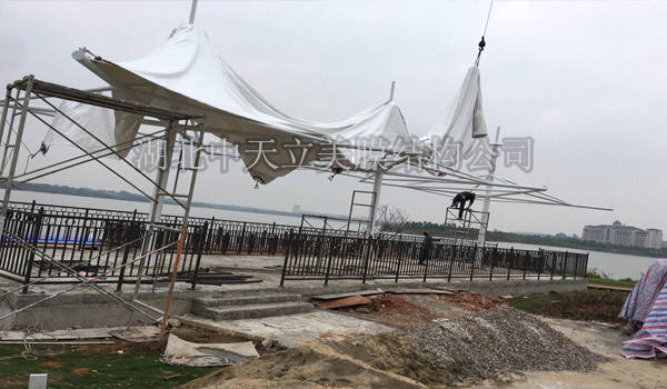 中天立美公司承接葛店游艇碼頭景觀膜結構工程項目,葛店游艇碼頭景觀膜結構面積385平方,該項目為永久式景觀張拉膜,其結構為三連帽內撐式帽頂膜結構,這種結構是很多客戶做景觀張拉膜項目的選擇,美觀實用。如果想了解景觀膜結構工程的,就隨中天立美小編一起來葛店游艇碼頭景觀膜結構施工現(xiàn)場來看一看。